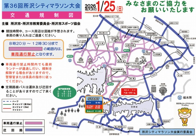 1月25日(日)、8:20~12:30の間、以下の道路が通行止めとなりますのでご注意ください。